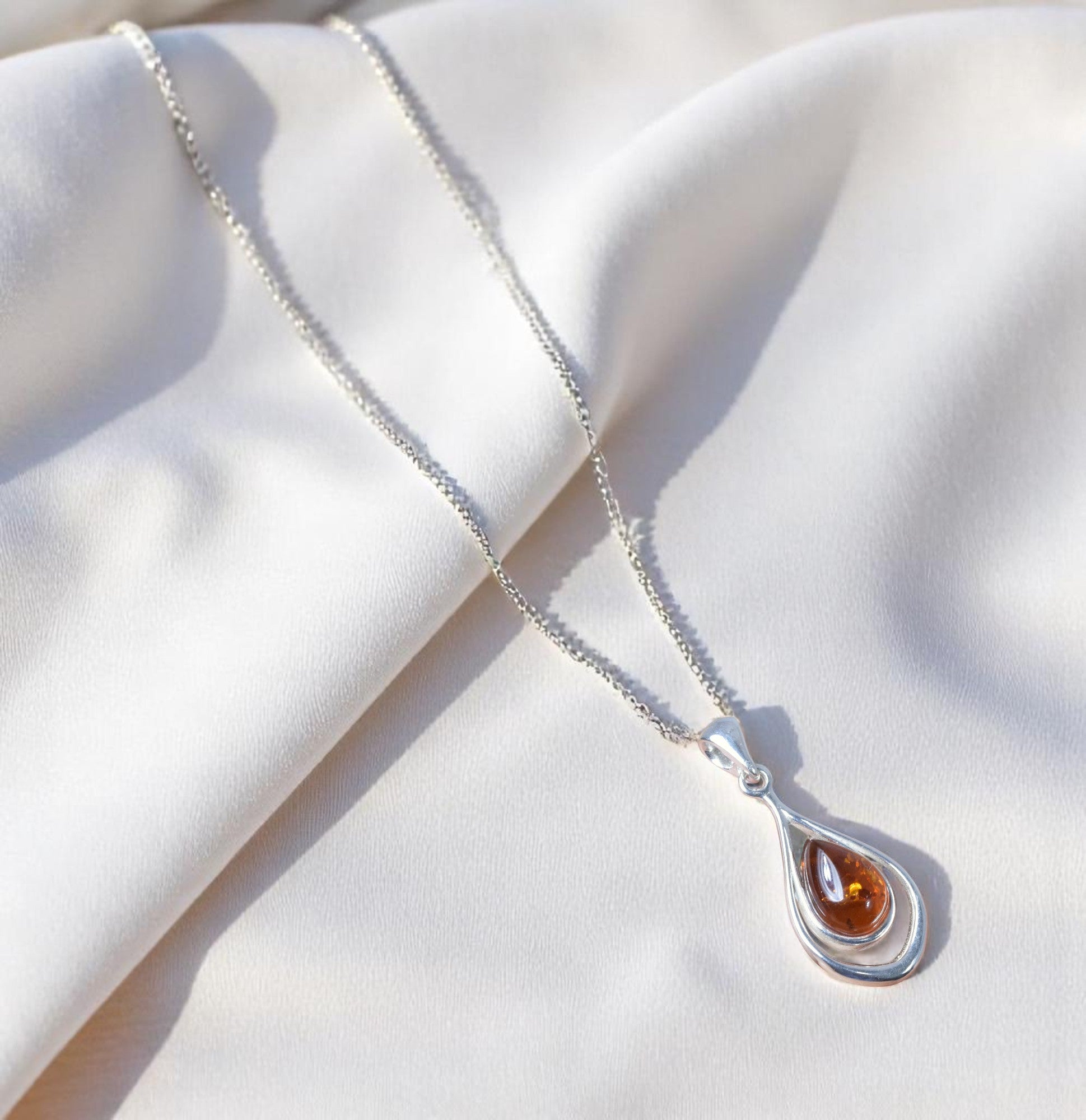 Elevate your everyday elegance with this Baltic Amber 925 Sterling Silver Teardrop Pendant Necklace, designed in a graceful double-drop wave motif. At the heart of the pendant is a rich, honey-colored Baltic amber cabochon, carefully set in a flowing sterling silver frame that mirrors the soothing curves of nature.